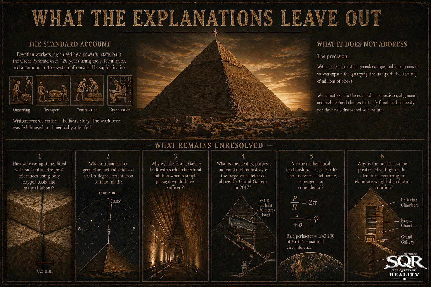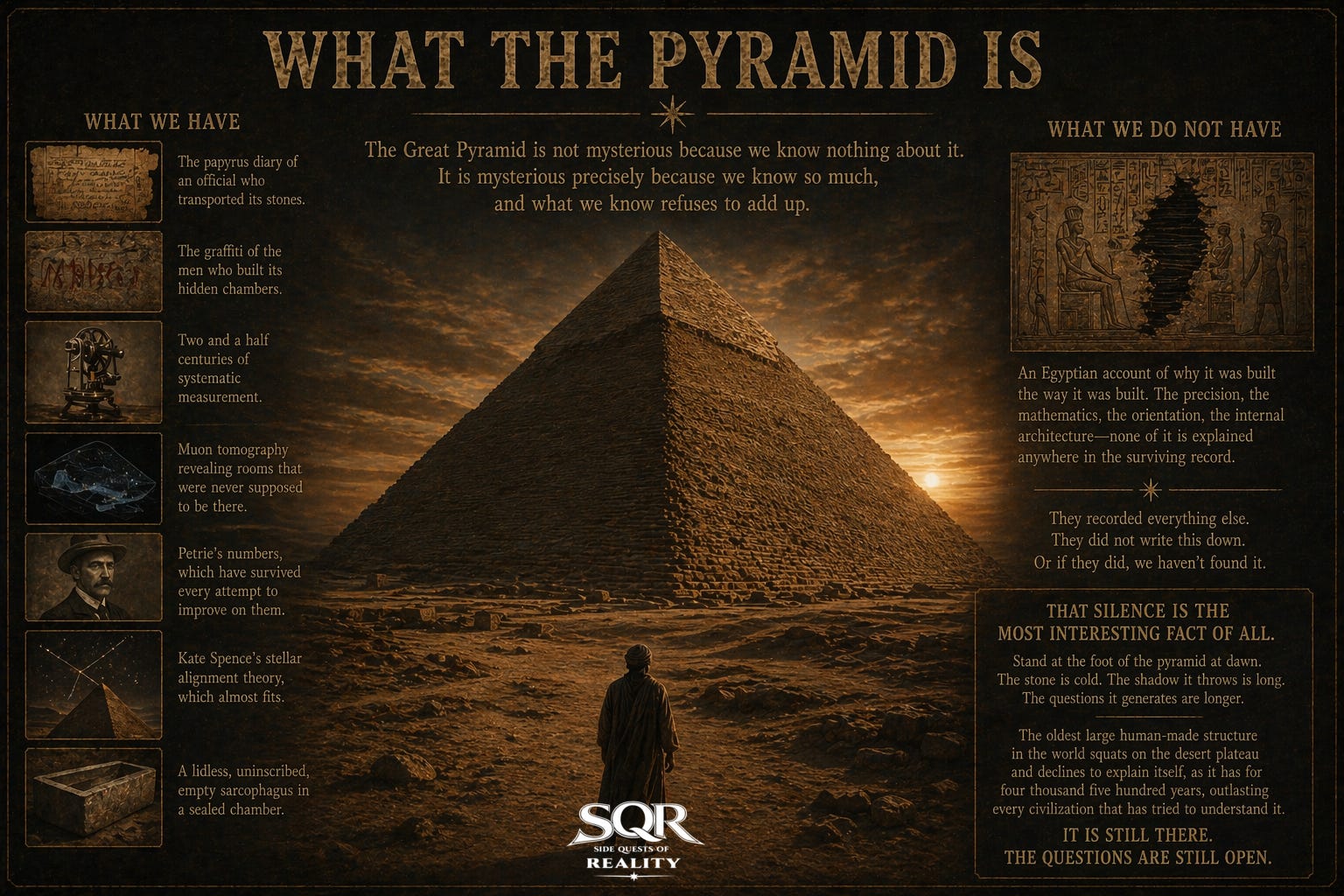 The Great Pyramid is not mysterious because we know nothing about it. It is mysterious precisely because we know so much, and what we know refuses to add up.