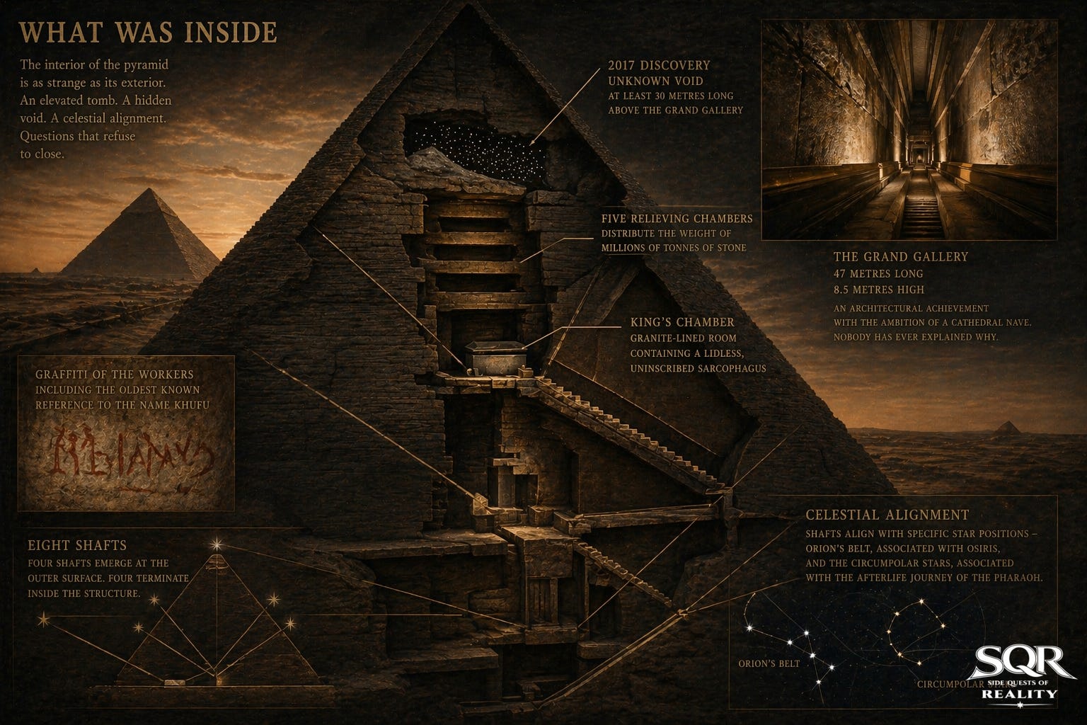 In 2017, the ScanPyramids project — an international team using muon tomography, a technique that uses cosmic-ray particles to see through stone the way X-rays see through flesh — announced the discovery of a previously unknown void inside the pyramid. It sits above the Grand Gallery and is at least 30 metres long. It has not been excavated. Its purpose, if it has one, is unknown. It is simply there, inside one of the most studied structures on earth, waiting to be explained.