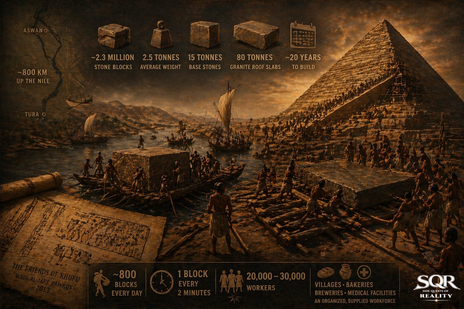 The workforce required to achieve this is estimated at between 20,000 and 30,000 people. Evidence found at the site — workers’ villages, bakeries, breweries, medical facilities — indicates this was an organized, fed, and housed professional operation, not a slave army of popular imagination. A papyrus discovered in 2013 at the port of Wadi al-Jarf, the oldest papyrus ever found, records a work gang called the Friends of Khufu transporting limestone blocks from Tura by boat. It describes their schedules, their rations, and the logistical chain that supplied the Giza site. It is the closest thing to a construction diary that survives, and it raises as many questions as it answers.