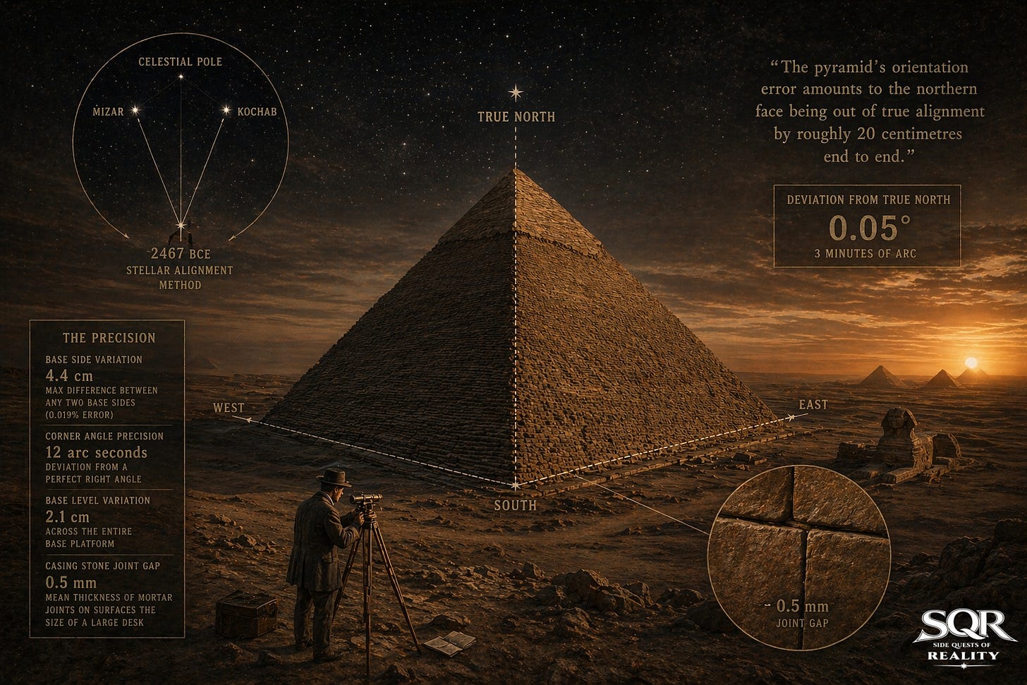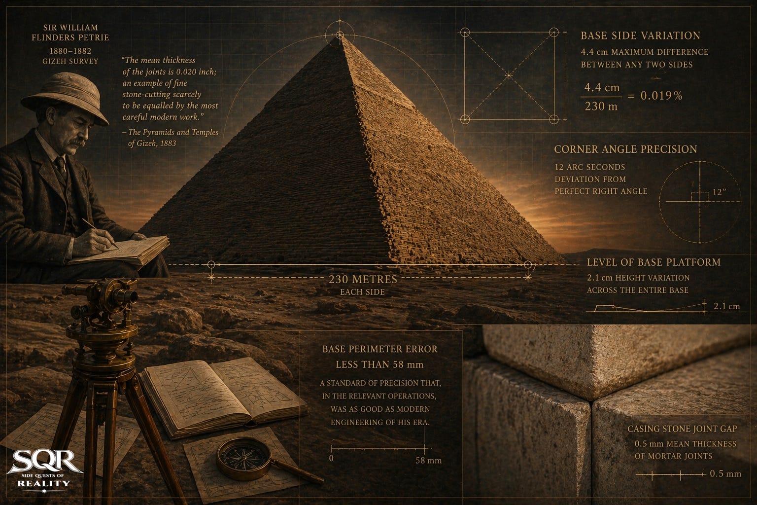 The four base sides of the pyramid differ from each other in length by a maximum of 4.4 centimetres. Across a base measuring 230 metres, that is a proportional error of less than 0.02 percent. The four corners deviate from perfect right angles by at most 12 arc seconds — one three-hundredth of a degree. The difference in height across the base, from the lowest corner to the highest, is 2.1 centimetres across 230 metres of desert plateau.