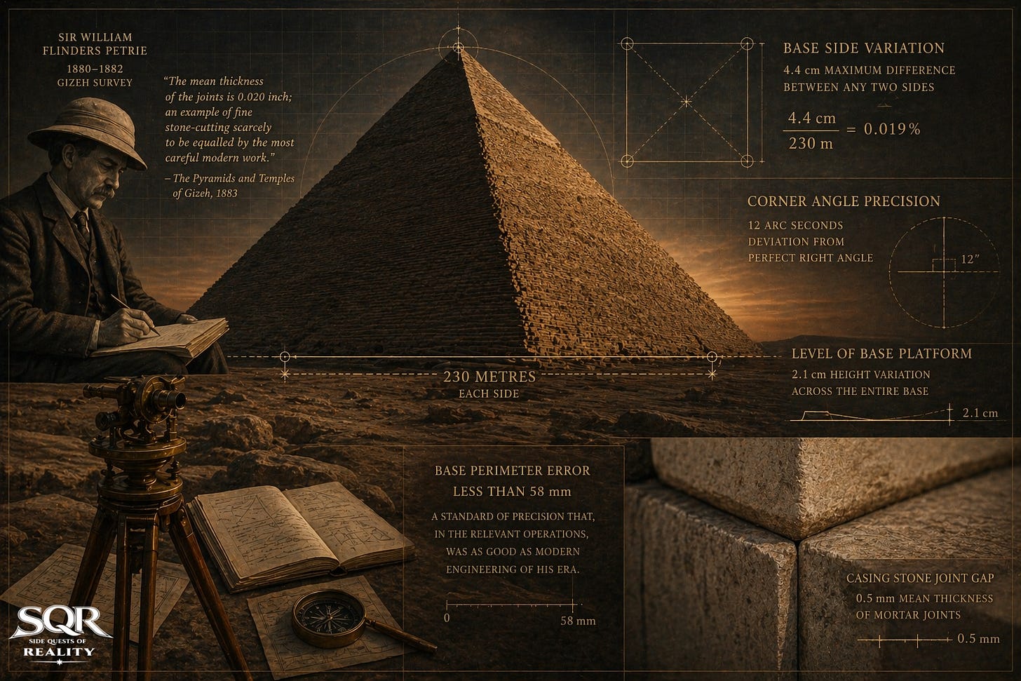 The dimensions of the Great Pyramid were surveyed in extraordinary detail by Sir William Flinders Petrie between 1880 and 1882. Petrie arrived at Giza a believer in the theory that the pyramid embodied mathematical codes and sacred ratios. He left having measured the structure so precisely that he demolished most of those theories himself — and replaced them with something more troubling: the actual numbers.