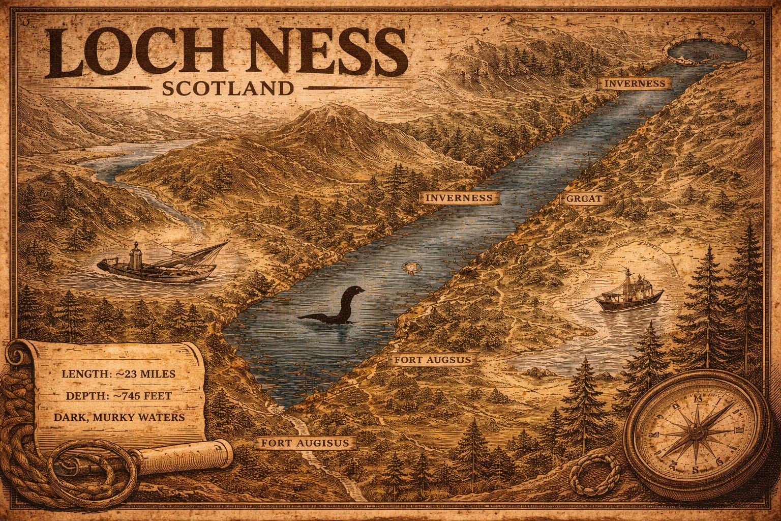 Loch Ness sits in the Scottish Highlands, running southwest to northeast along the Great Glen fault. It was carved by glaciers and is connected to the sea via the River Ness and the Caledonian Canal. Its depth is remarkable for a freshwater body in Scotland, reaching 230 meters in places, with an average depth of around 132 meters.