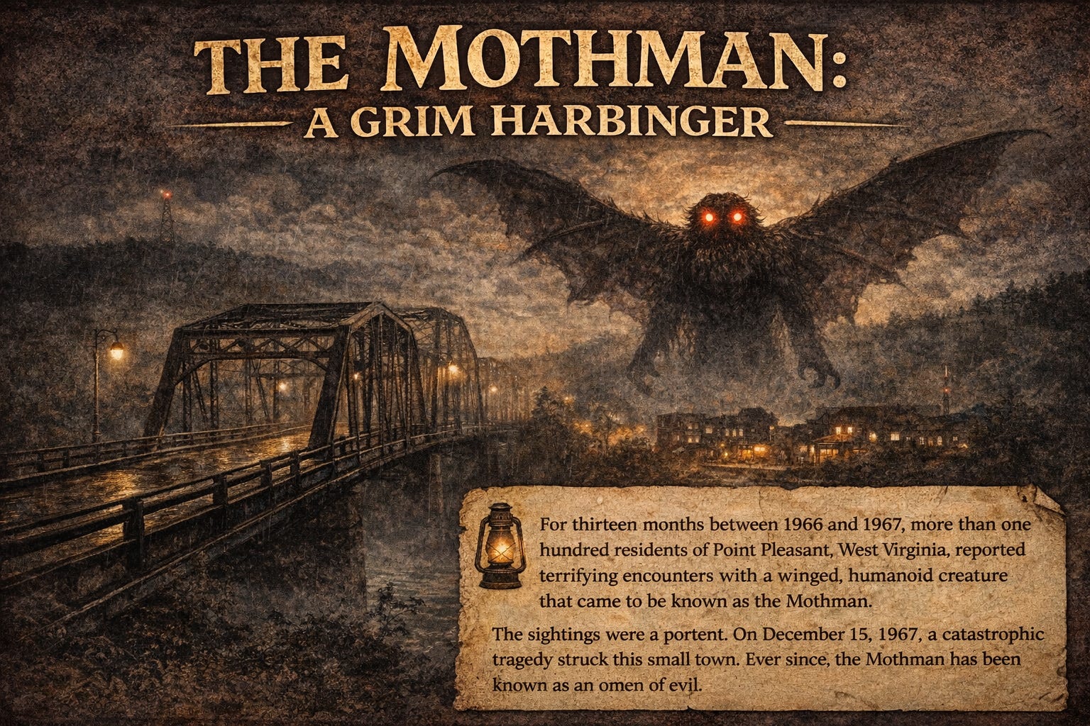Three days later, two young couples driving near an abandoned World War Two munitions facility outside Point Pleasant saw something standing near the road. They described it as a large flying man, six to seven feet tall, with massive wings folded against its back and eyes that glowed red when their headlights caught them. When they drove away, it followed. They pushed their car to speeds approaching a hundred miles per hour on the road back toward town. The thing kept pace with them in the air before breaking off at the city limits.