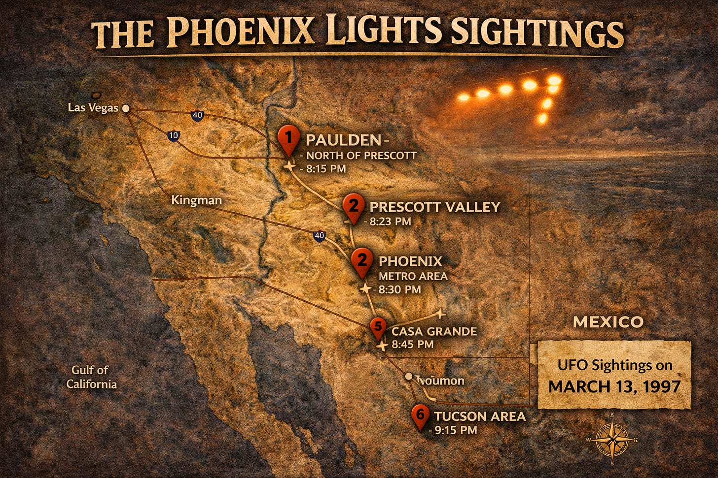 The first began at approximately 7:30 PM. This is the event described above. The massive silent formation tracked across the state over a period of roughly two hours, generating witness reports from Nevada through central Arizona into the Phoenix metro area and beyond. It was seen by pilots, police officers, former military personnel, and ordinary residents across a geographic corridor hundreds of miles long.