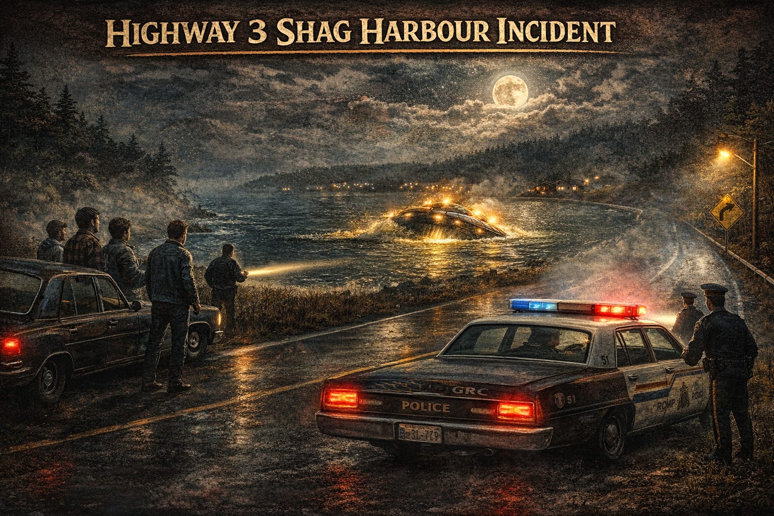 Meanwhile, RCMP Constable Ron Pound was already driving Highway 3 toward the harbour when he saw the lights himself. He estimated the object at roughly 60 feet in length. Four orange lights, all attached to a single structure, flashing in sequence before tilting at a 45-degree angle and diving toward the water’s surface.