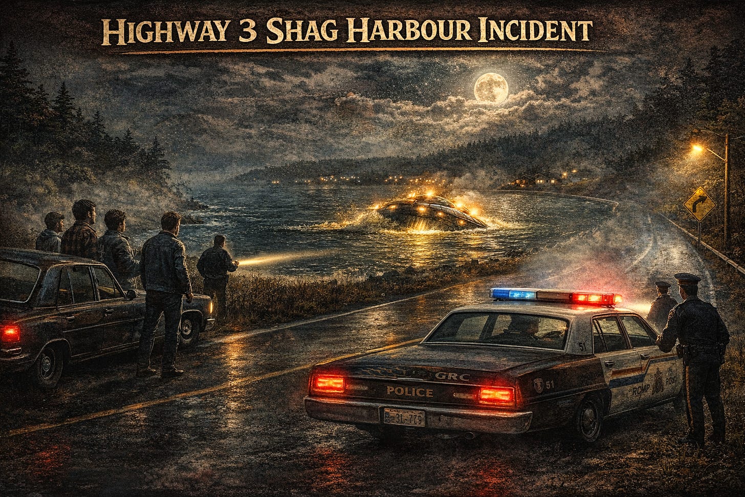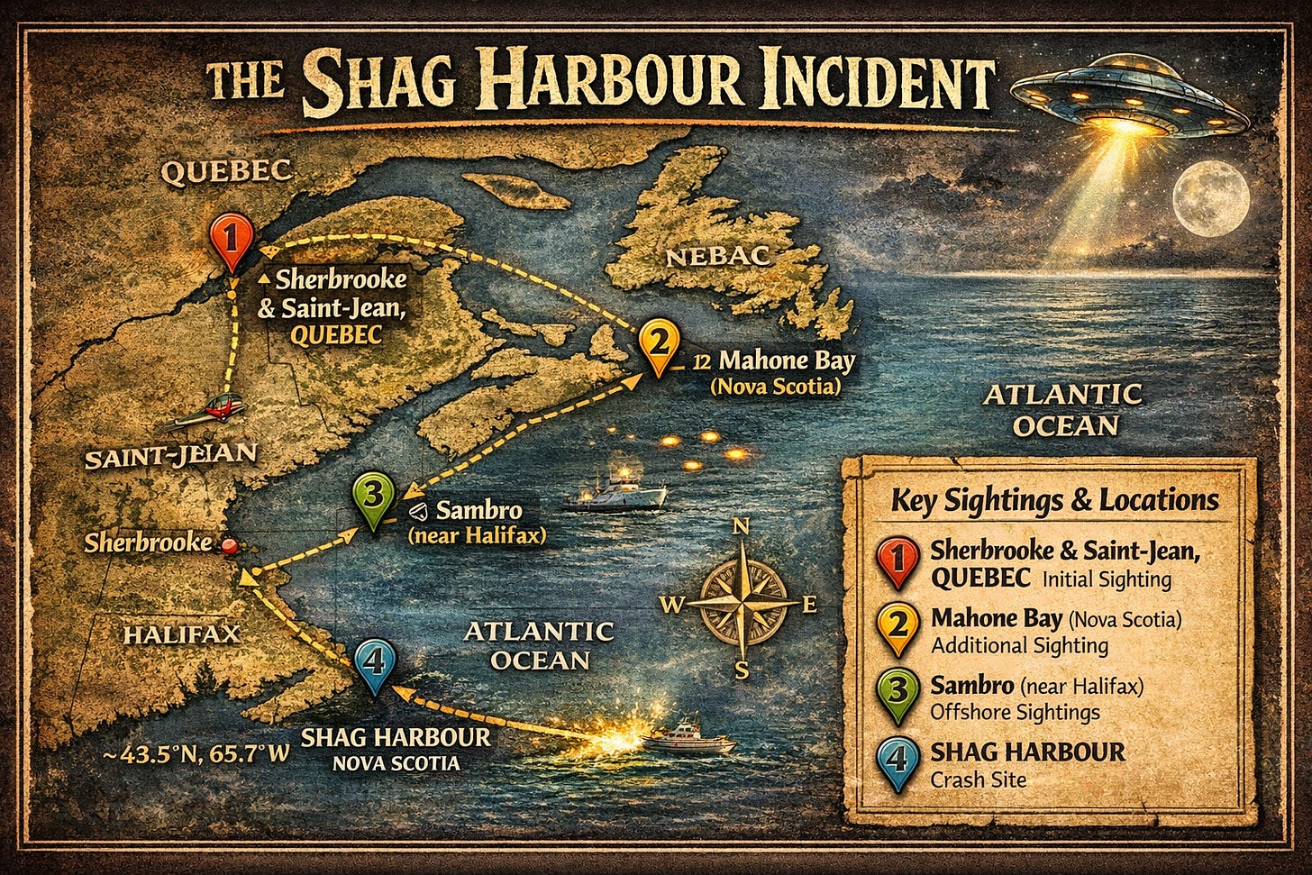 Shag Harbour is a tiny fishing village at the southern tip of Nova Scotia. In 1967 it was so small it appeared on almost no maps. The people there lived off lobster fishing. The local stories involved sea serpents, ghost ships, and giant squid.