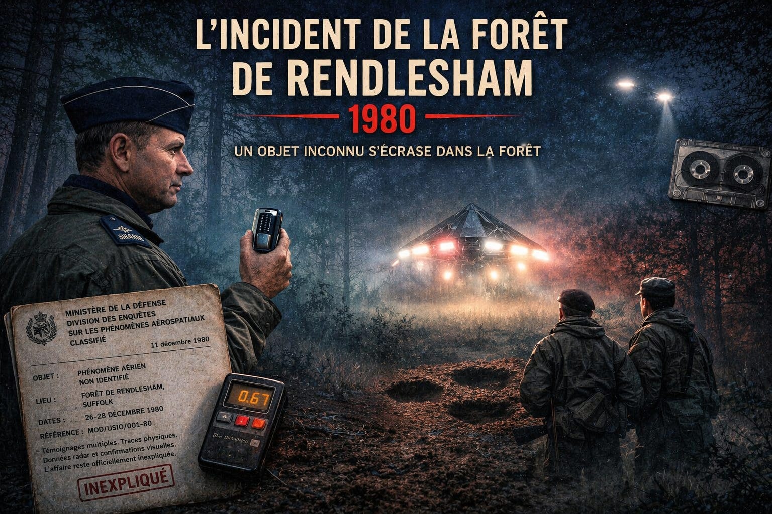 Ce qui suit, au cours des trois nuits suivantes, implique le commandant adjoint d’une base de l’armée de l’air américaine enregistrant sa propre voix en temps réel alors qu’il pourchasse quelque chose à travers une forêt du Suffolk, en Angleterre. Cela implique des empreintes au sol, des relevés de radiation, des symptômes physiques qui mettraient des décennies à être officiellement reconnus, ainsi qu’un enregistrement audio qui demeure, quarante-cinq ans plus tard, l’un des documents les plus étranges jamais produits lors d’une enquête militaire.