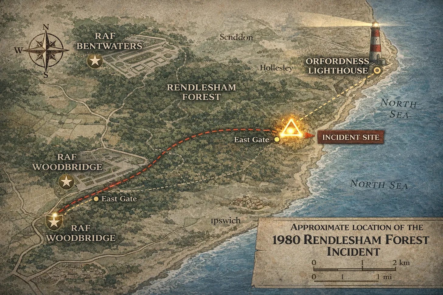 La forêt de Rendlesham se situe dans le Suffolk, sur la côte est de l’Angleterre, à environ treize kilomètres d’Ipswich. En décembre 1980, elle bordait deux installations de l’armée de l’air américaine opérant sous commandement OTAN : la RAF Bentwaters au nord et la RAF Woodbridge à l’ouest. Ensemble, elles formaient l’une des présences militaires américaines les plus stratégiquement importantes d’Europe, abritant des appareils A-10 Thunderbolt et, selon des récits persistants qui n’ont jamais été officiellement confirmés ni démentis, des armes nucléaires tactiques.