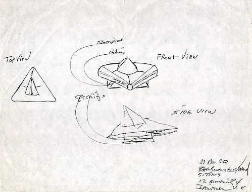 Il décrivit un engin. Triangulaire, d’environ deux mètres soixante-dix de long et un mètre quatre-vingt de haut. Fabriqué dans un matériau lisse, noir, semblable à du verre. Couvert de symboles ressemblant à des hiéroglyphes. L’un d’eux, un triangle dans un cercle, était plus grand que les autres. L’engin reposait sur trois pieds. Il rétracta ensuite ces pieds et se faufila entre les arbres.